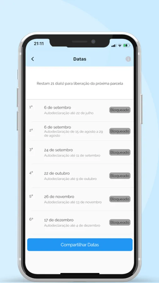 Esta página você pode consultar a data certa de pagamento do benefício auxílio caminhoneiro. No inicio da pagina você poderá visualizar quantos dias faltam para liberação da próxima parcela do benefício. caso alguma parcela já esteja liberada, um card indicativo no canto direito será exibido na cor verde com a escrita liberado e o contador de dias passara a informar os dias restantes para o próximo saque. Enquanto a parcela não estiver liberada o card indicativo estará com a palavra Bloqueado indicando que a parcela ainda não foi liberada para os beneficiários. Não é possível realizar transações bancárias com este app.