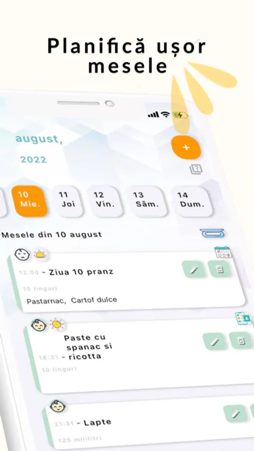 - 2 variante de meniuri pentru primele saptamani de diversificare pe care le poti importa direct in calendarul din aplicatie