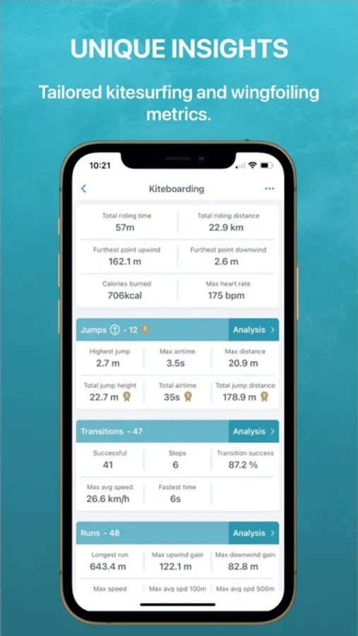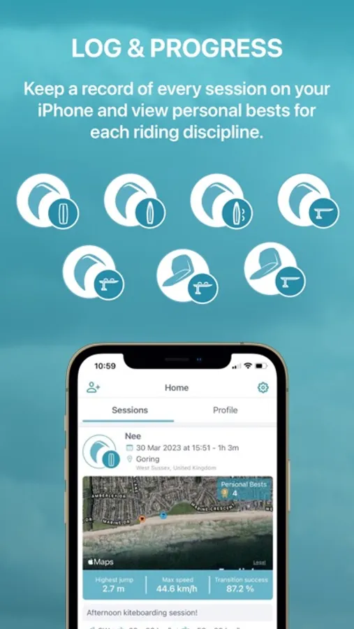 Access your tailored kitesurfing and wingfoiling statistics on your iPhone. See your ‘best in sessions’ and ‘personal bests’.