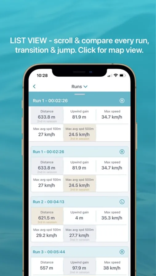 Go deeper into your stats and view, filter and compare every run, transition or jump. Either relive your session visually by scrolling through your tracks on a map, or view your statistics in a list to scan, compare and focus down on a particular aspect of your performance, which you can then select to view on a map.