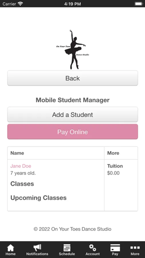 The On Your Toes Dance Studio app allows you to manage your account with ease, register for classes, make payments to your dance studio account, check out the studio class schedule, keep up on current studio events, and a easy way to communicate. You will also receive notifications of when tuition is due and monthly updates.
