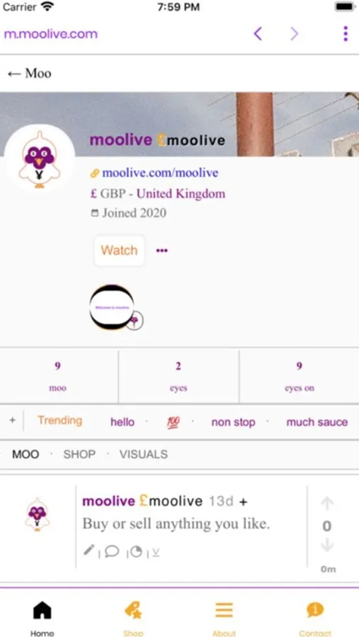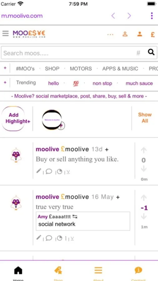 Moolive is a social marketplace where you can connect, trade and interact with others. We are a very small team of less then 5. We plan to create a big team, in the near future, who will help make this site better, bigger and more user friendly. We came up with this idea to help people make money whilst connecting with people globally and enabling them to share content. The site's name was thought of due to the following breakdown: 'Moo' stands for (More Online Opportunities) and 'live' (in regards to live updates). Users will be able to create accounts, post videos, upload photos, upload music, make listings and post products all of which will be labelled as 'Moos'.