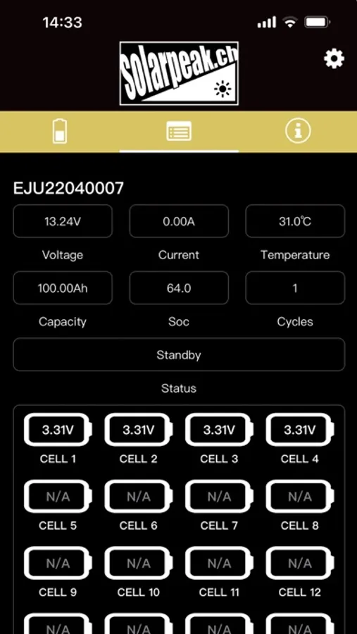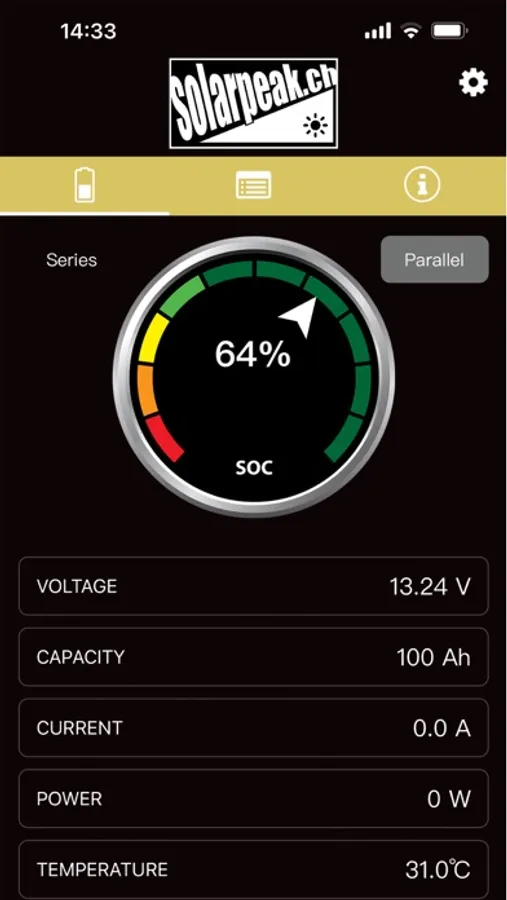 The Apps main feature is to monitor the details of the Solarpeak Lithium batteries. It can monitor multiple batteries at the same time, showing the main data details after series or parallel, showing details of each battery. Re-nameable each battery pack and auto-connect. The Phone via Bluetooth connectivity will monitor the following information from the battery.