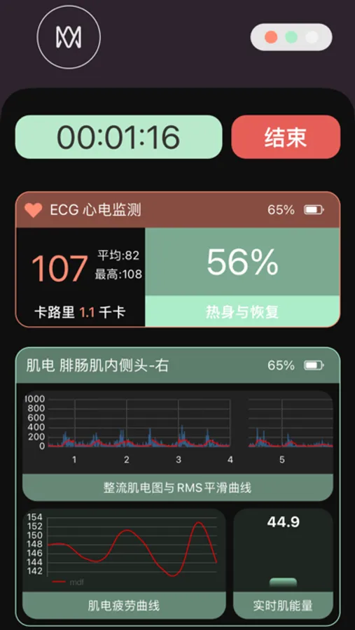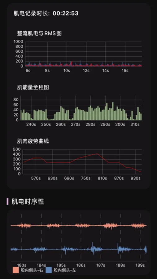 - 实时肌电、肌能量、疲劳度显示