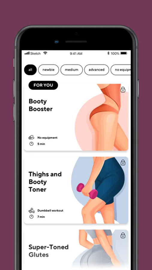 Work your glutes, hips, thighs, and legs with a range of bodyweight, resistance bands, and dumbbell routines.