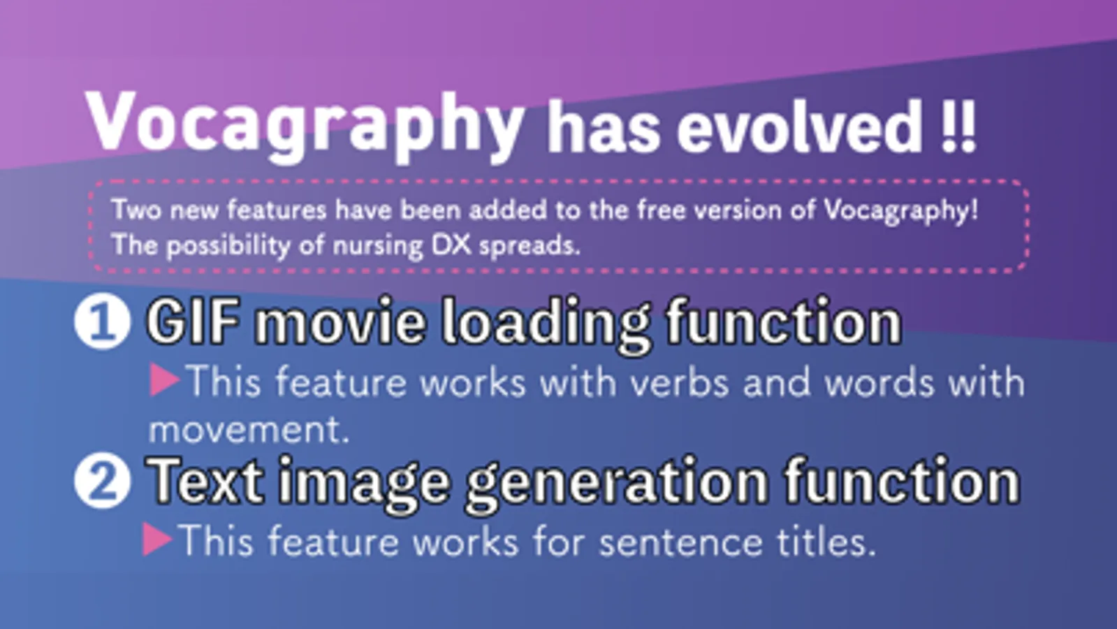 New function 2: "Generate text image" function has been added. As children progress through the grades, they will study sentences more than words. In the previous version of "Vocagraphy!", it was necessary to input text on a computer, etc., export it as an image, and import it into app. With the "Generate text image" function, you can create a text image in "Vocagraphy+" and study it right away. For more information on how to use it, please refer to our website.