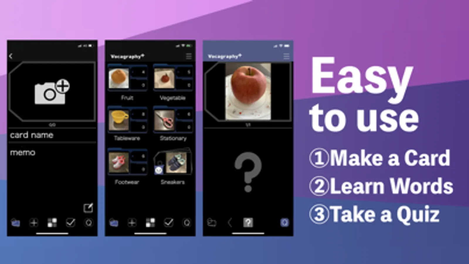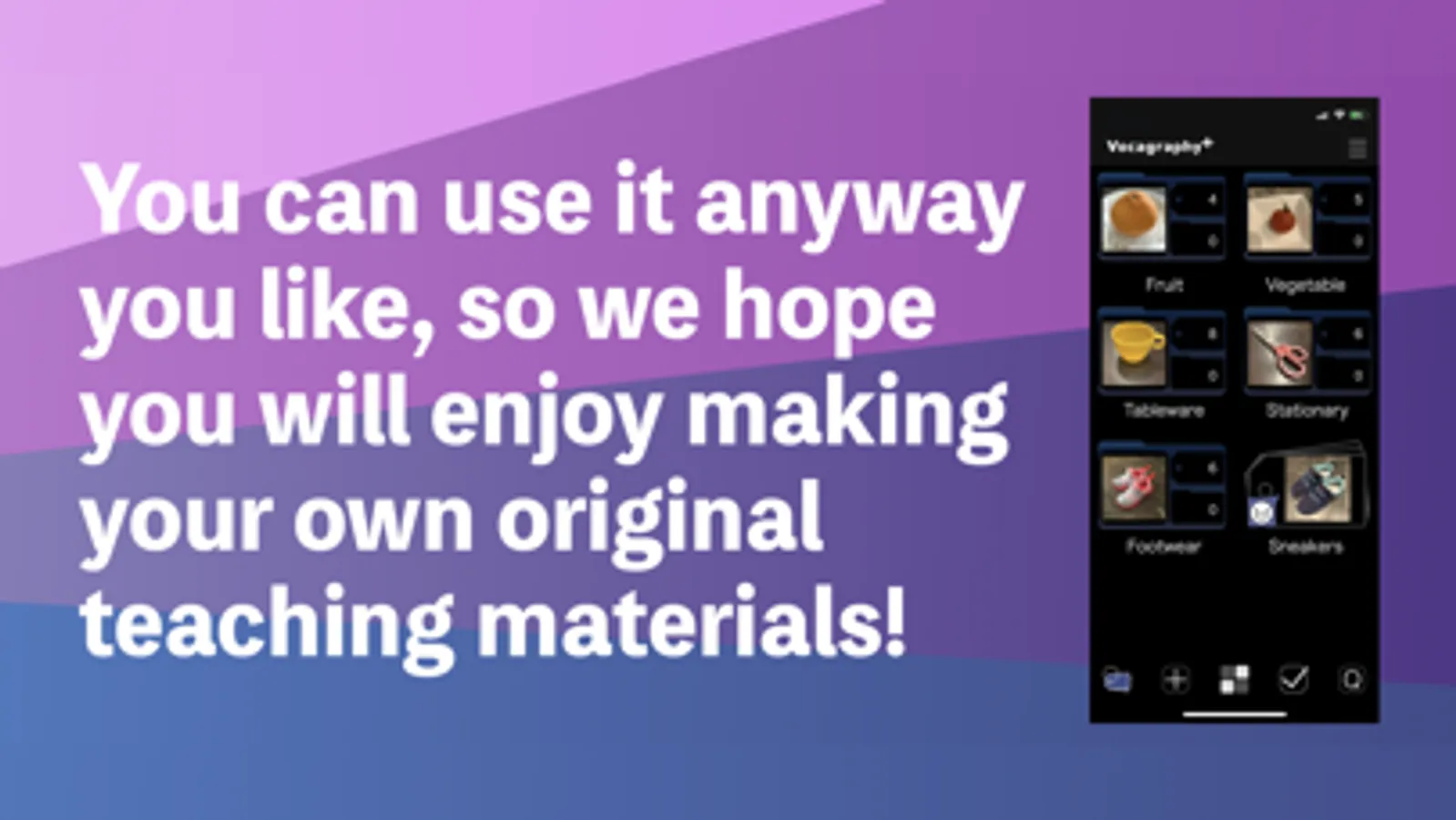 "Vocagraphy" is simple to use. Just make a card, import a photo, and add text. You can use it anyway you like, so we hope you will enjoy making your own original teaching materials!