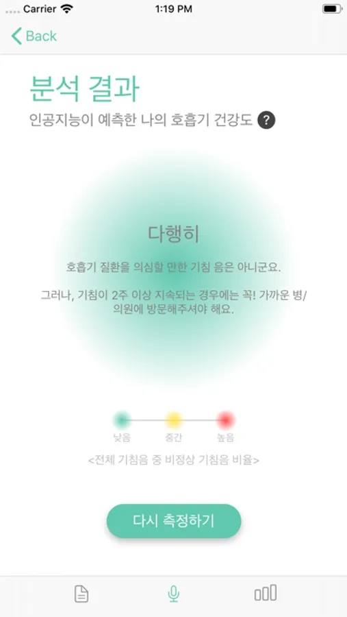 - 인공지능이 분석하여 비정상음의 비율에 따라 신호등 형태로 결과를 확인할 수 있습니다
