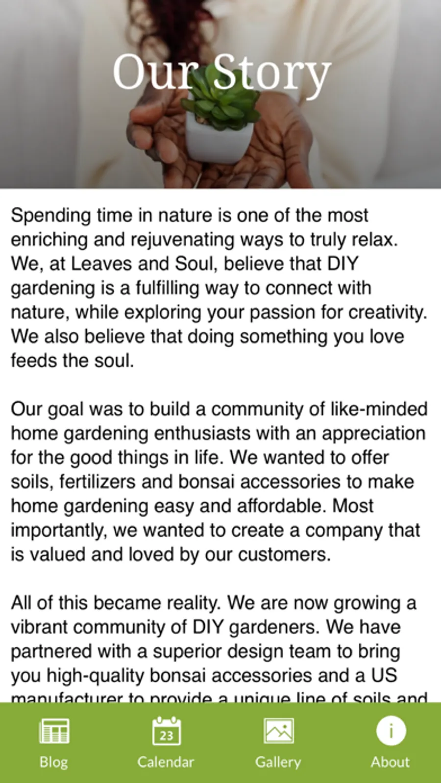 At Leaves & Soul, we believe in the art of taking a simple plant or tree and turning it into a reminder of nature’s beauty within your home. This app is for who wants to start gardening and wants to find better gardening tips, DIY gardeners, do's and don'ts for nurturing your plants.
