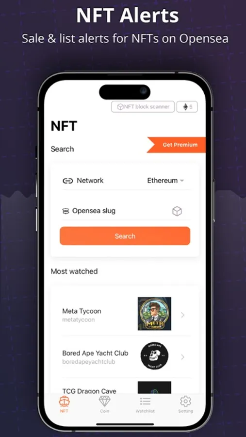 You can set price alerts for NFTs that traded on OpenSea, the largest NFT Marketplace. Get “Top transfers, top mints, top burns, top buyers, top sellers” information with “NFT block scanner”. Using this information, you can find NFT projects that you can invest in.