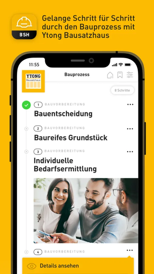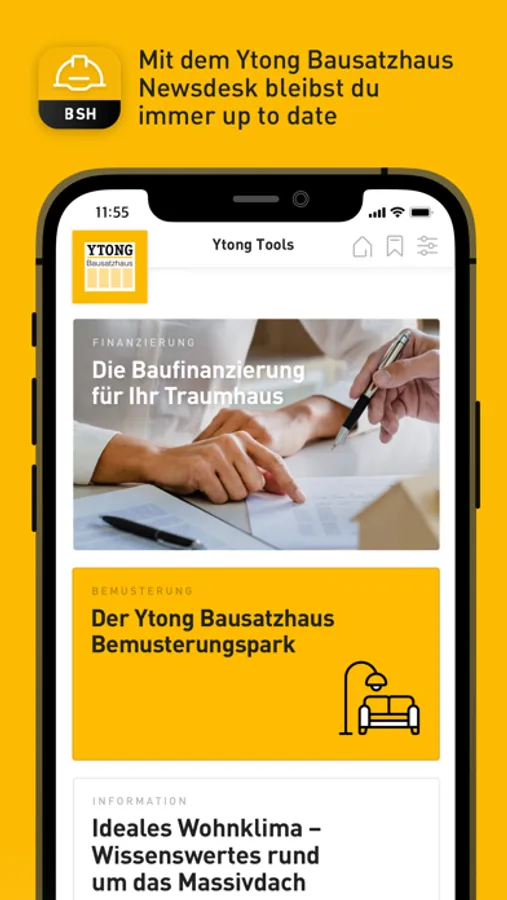 Mit der Ytong Bausatzhaus App haben Sie zu jeder Zeit einen Überblick, an welcher Stelle Sie sich im Bauprozess befinden und welcher Schritt als nächstes folgt. Darüber hinaus bleiben Sie mit dem Ytong Bausatzhaus Newsdesk immer up to date und werden über laufende Angebote und Neuheiten in der Baubranche informiert.
