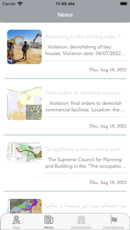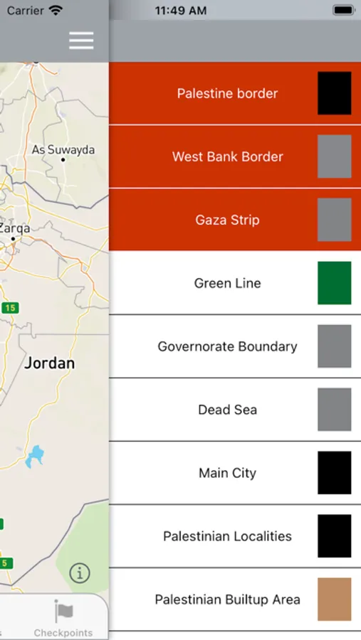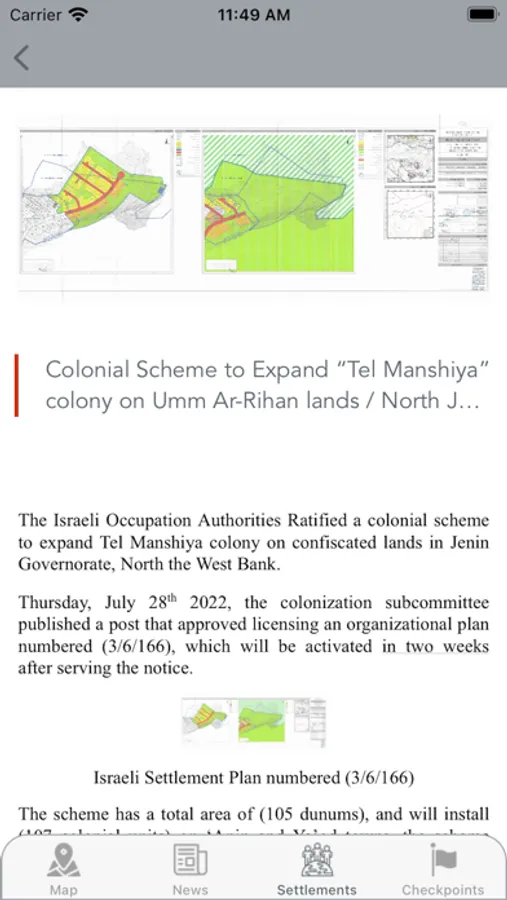 The Applied Research Institute - Jerusalem (ARIJ) and its partner the Land Research Centre (LRC) are Palestinian Non-Governmental Organization working toward monitoring all what is related to Israeli activities and affecting the Palestinian surrounding. It include activities related to settlements, outposts, the separation wall, land confiscation, hoses demolition, uprooting trees, etc. their work is to measure the impact and the implications of the Israeli Colonizing activities in the occupied Palestinian territory (the West Bank-including East Jerusalem, and Gaza) on the Palestinian environment; including the peace process and the “Two State Solution”.This mobile application falls within the project prescribed activities and is intended to provide an online interactive map. It is meant to act as a bridge to pass on important information related to Israeli settlement activities in the occupied Palestinian territory, and thus gives access to the public with dynamic map legend, including the ability to query each layer attribute data within the map and the ability to pan, zoom, get information, hide and show layers.
