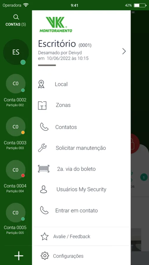 O VK Monitoramento é um aplicativo móvel onde o cliente monitorado pode acompanhar diretamente via celular ou tablet todas as atividades do seu sistema de segurança. Por meio do aplicativo, é possível saber o status do painel de alarme, armá-lo e desarmá-lo, visualizar as câmeras ao vivo, verificar eventos e ordens de serviço abertas, além de realizar chamadas telefônicas para contatos cadastrados no seu perfil. É a segurança que você precisa na palma da sua mão.