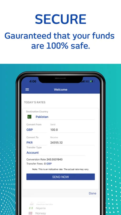 Send money to: AED (UAE Dirham), BDT (Bangladeshi Taka), BWP (Botswana), GHS (Ghana), IDR (Indonesian Rupiah), INR (Indian Rupee), KES (Kenyan Shilling), MWK (Malawi), MYR (Malaysian Ringgit), MZN (Mozambique), NPR (Nepal), NGN (Nigerian Naira), PHP (Philippine Peso), PKR (Pakistan Rupee), RWF (Rwanda), SGD (Singapore Dollar), UGX (Uganda), ZWD (Zimbabwe).