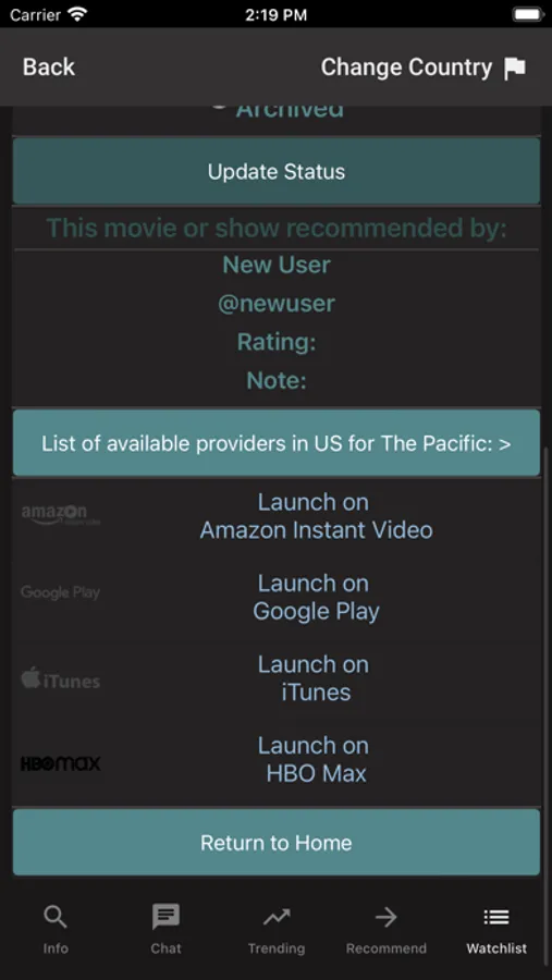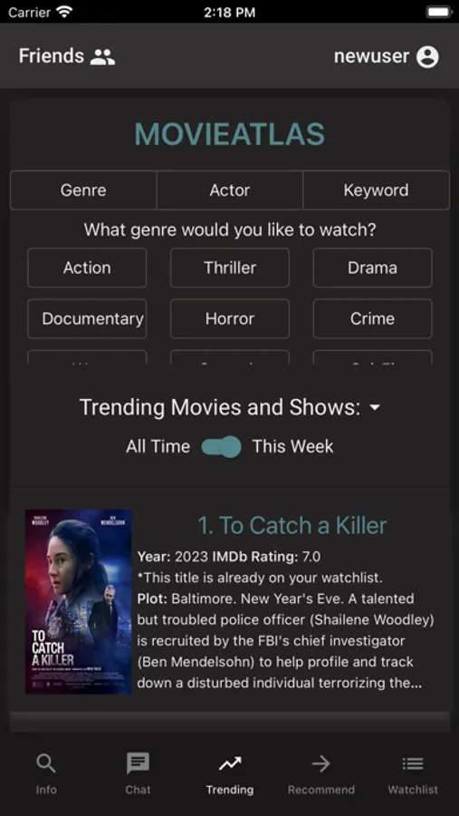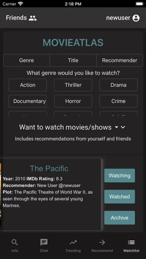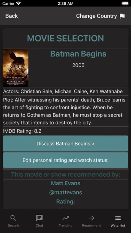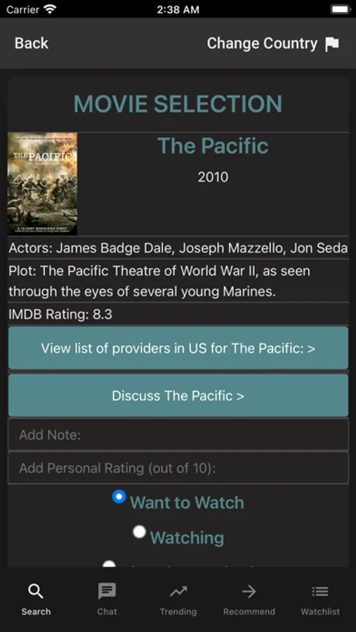 MovieAtlas is an app that allows you to view movie and show recommendations from your friends easily and discuss them. In addition, you can see what's trending and find similar movies and shows, add to your own watchlist and choose to keep it private or share it and view other friends or public watchlists. You can also view information and ratings, find what provider is carrying the content by country for easy viewing as well as chat with friends.