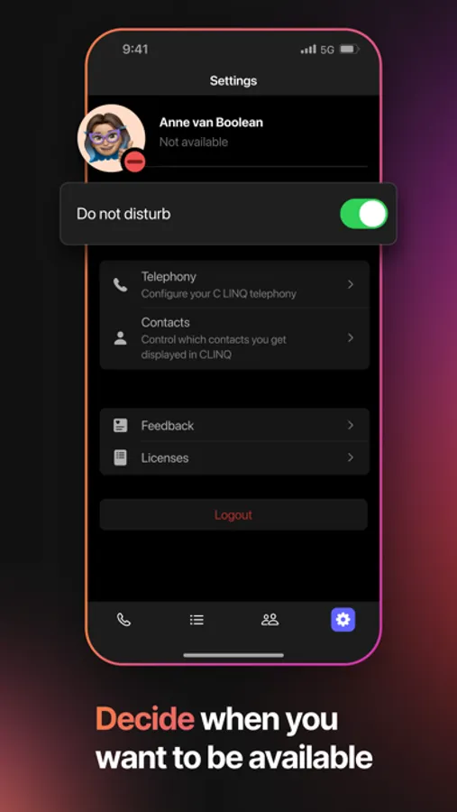 Happy Hour? With CLINQ you can easily determine your availability from your smartphone, so you can enjoy your well-deserved free time undisturbed.