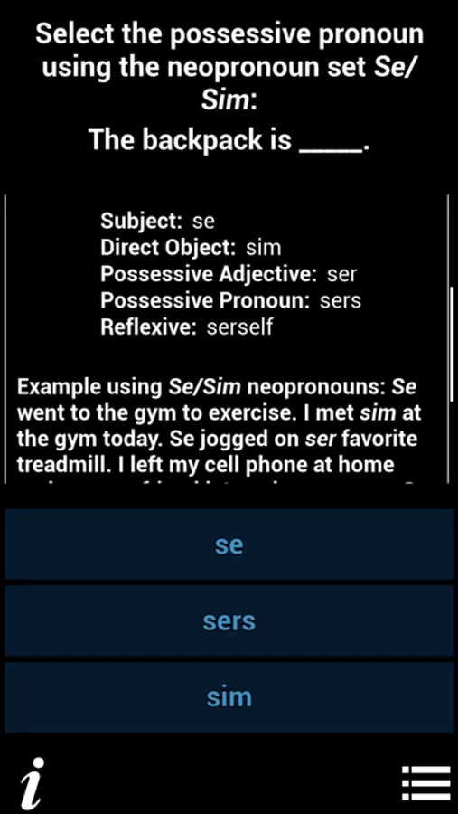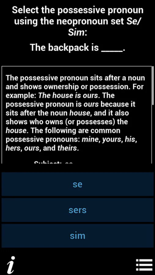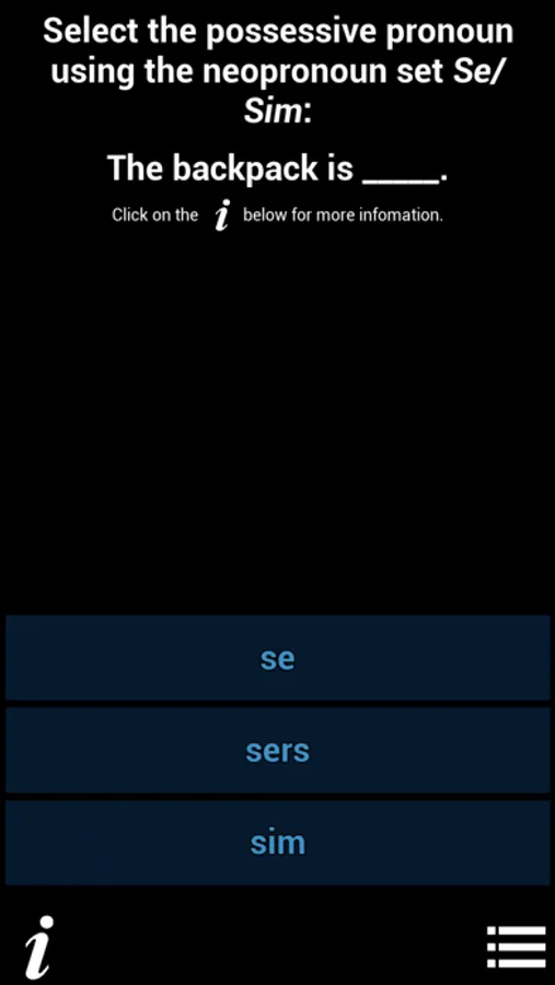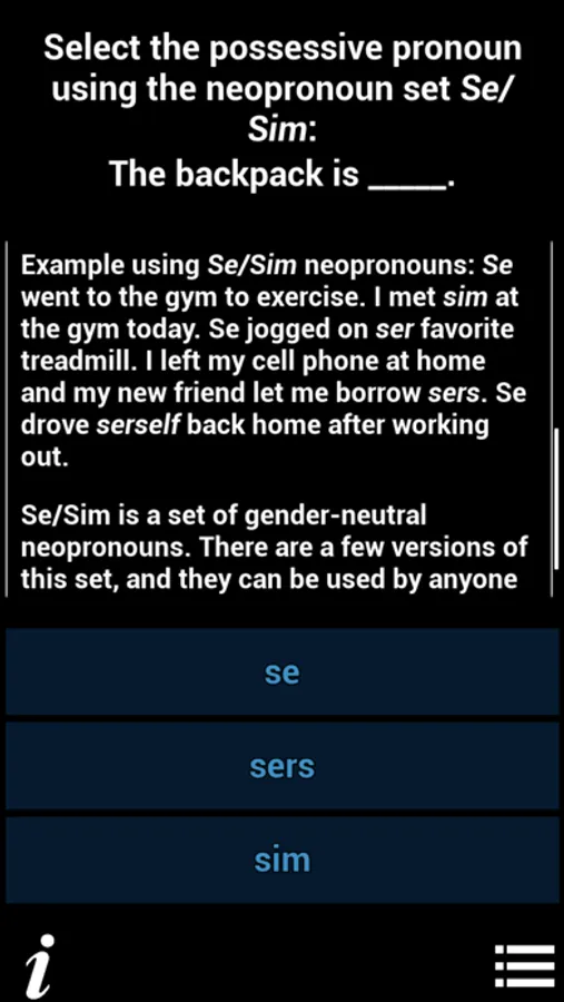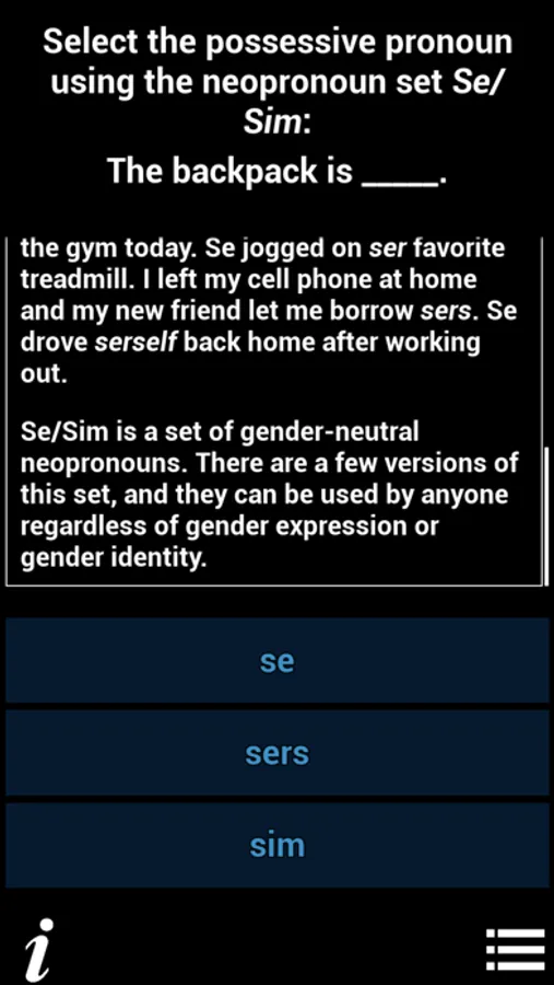 If you ever need any help, hit "i" for information, and a box will appear explaining the parts of speech, the neopronoun in its different forms, a short story using the neopronouns, and when possible, an explanation of the creation and history of the neopronoun.