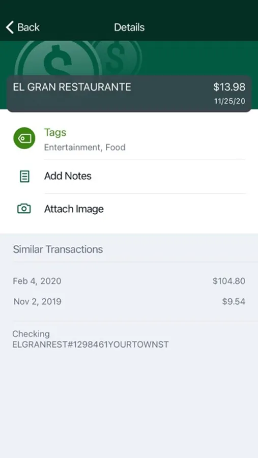 - Keep your transactions organized by allowing you to add tags, notes and photos of receipts and checks.