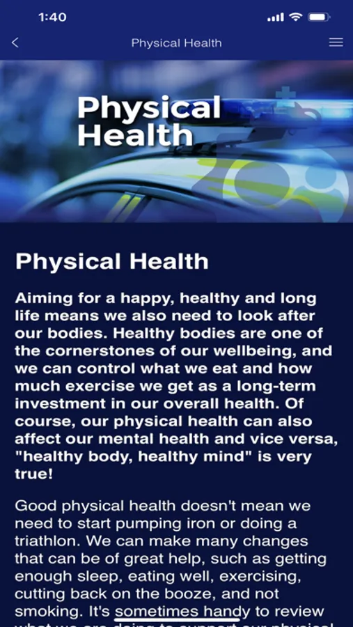 The App covers a range of problems faced by officers and staff in the Police service, such as anxiety, stress, PTSD (Post Traumatic Stress Disorder), depression, eating disorders, self-harm, and more. It gives practical advice and support on how officers can maintain good mental health, spot warning signs for themselves and others, plus advice on how to get help for themselves and colleagues.