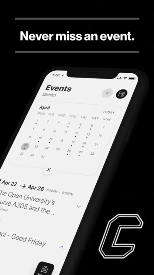 The event section shows a list of events throughout the district. Users can add an event to their calendar to share the event with friends and family with one tap.