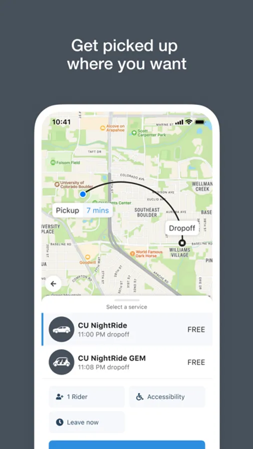 CU NightRide allows you to request safe, free evening transportation to and from any location within Boulder city limits. Whether you need to travel across campus or to a neighborhood off-campus, CU NightRide student drivers can get you there. Simply download the CU NightRide app to request a ride. Once the ride is scheduled, you can track the vehicle’s location in real time. CU NightRide is available only to current CU Boulder students, faculty and staff.