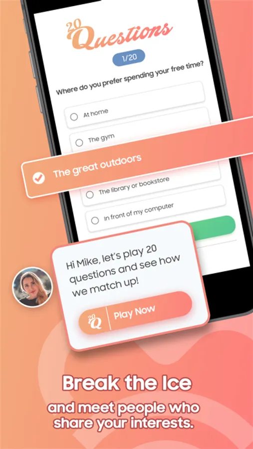 Make your profile shine by playing 20 questions. Interested in someone and want to know what they are into? Break the ice and ask them to play a round.