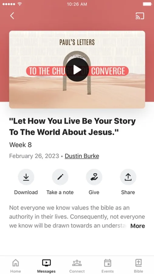 This app will help you stay connected with the day-to-day life of Converge. With this app you can: watch or listen to past messages; stay up to date with push notifications; share your favorite messages via Twitter, Facebook, or email; and download messages for offline listening.