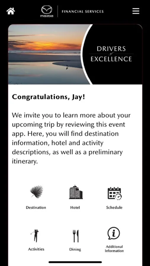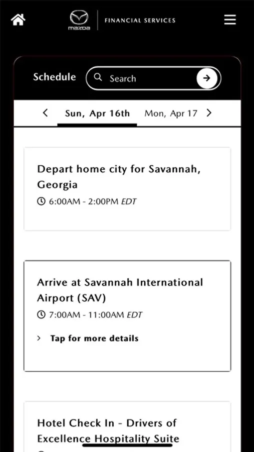 The Mazda Financial Services app supports Mazda Motor Credit Corporation events. Only invited attendees may access the application, which will serve as a mobile resource for the event. The app includes a schedule of events, list of attendees, maps, and other important information.