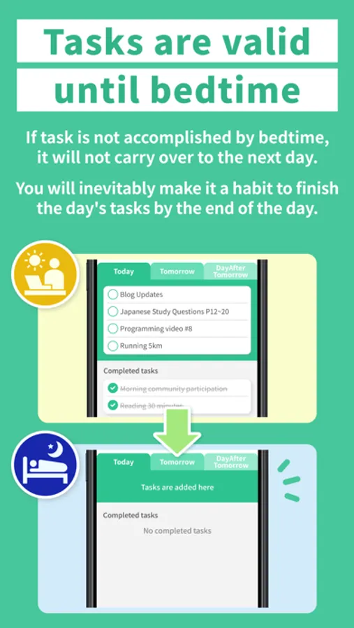 Even if a task remains unaccomplished until bedtime, the unaccomplished task will not be carried over to the next day.