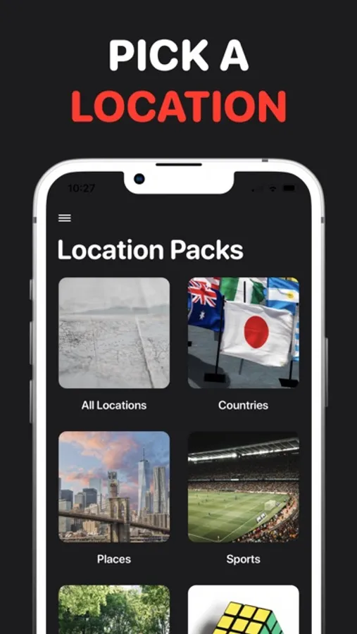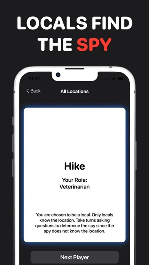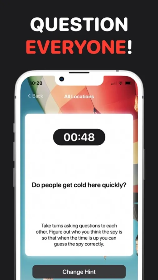 Put your investigating skills to the ultimate test by determining who is the spy in the group. One person will be the spy, if that is you, see if you can keep your identity concealed! There are locals and one spy. The locals will know the exact location and the spy will only know that they are the spy. Ask each other questions to try to come to a conclusion who is the spy. Once the time is up, point at who you think the spy is. If the majority of the players get it right, the locals win. If the majority of the players get it wrong, the spy wins!