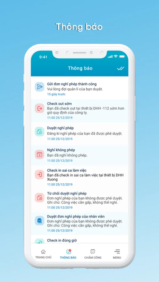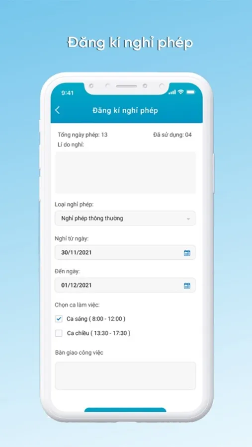 - Tạo yêu cầu: Nghỉ phép; đổi ca làm việc; xin đi muộn, về sớm;…