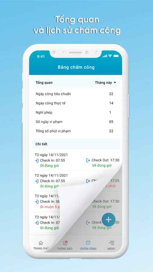- Theo dõi chấm công: lịch sử checkin, số ngày công làm việc trong tháng,…