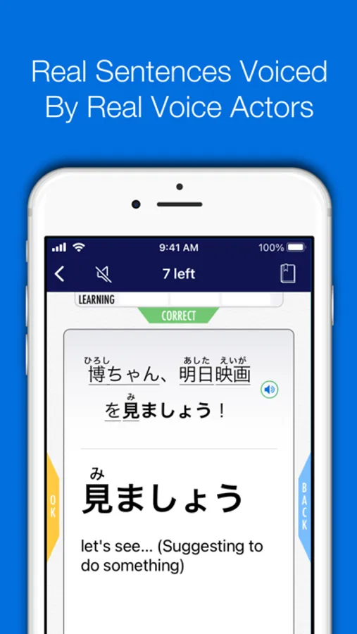 Instead of a traditional textbook, everything in Nihongo Lessons is in a flashcard format. Flashcards are easier to take in, easier to know how much to learn and how often to review, and simplify the mountain of information you need to absorb. Each flashcard introduces one new sentence for you to understand, and every new sentence introduces exactly one new word, grammar point, or concept. This keeps you constantly moving forward in your learning journey - never bored, never overwhelmed.