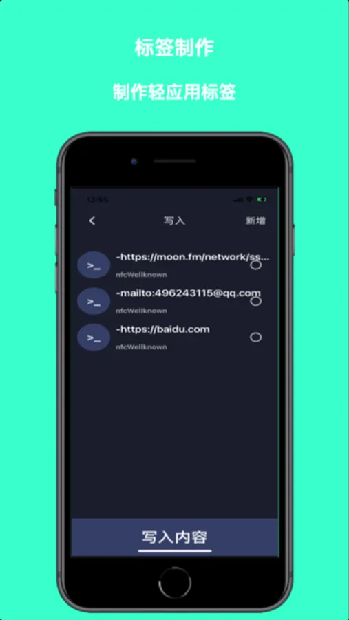 这是一款帮助你写入和读取nfc标签的小工具,你可以使用此产品,将创建的文本数据写入到标签中,在支持nfc的手机设备上即可读取内容或打开轻应用。