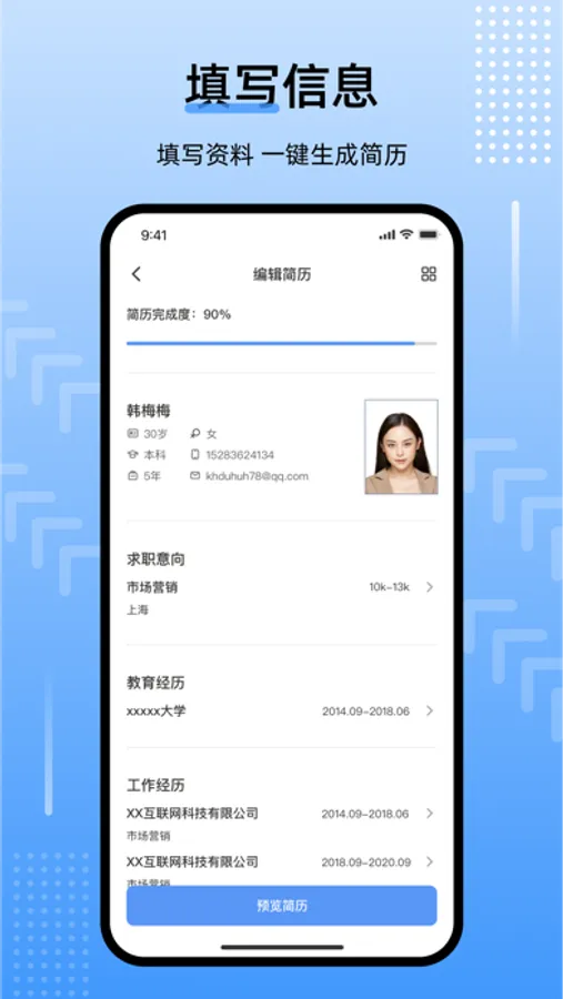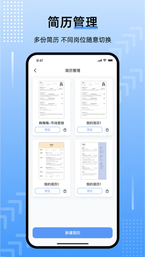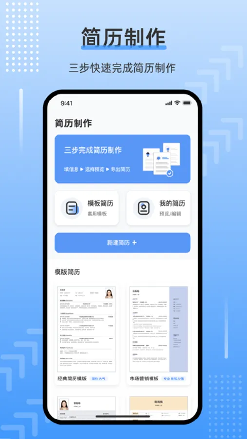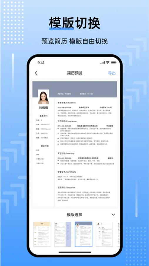 简历制作是一款专业、高效、智能的简历工具,只需几分钟就可以制作一份吸人眼球的简历提供丰富简历模板库,制作个性化简历不发愁,让您的简历脱颖而出,校园实习,应届求职,跨界求职更加效率便捷,适用于所有的求职人员。