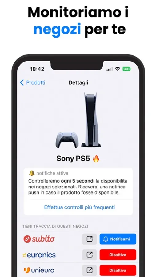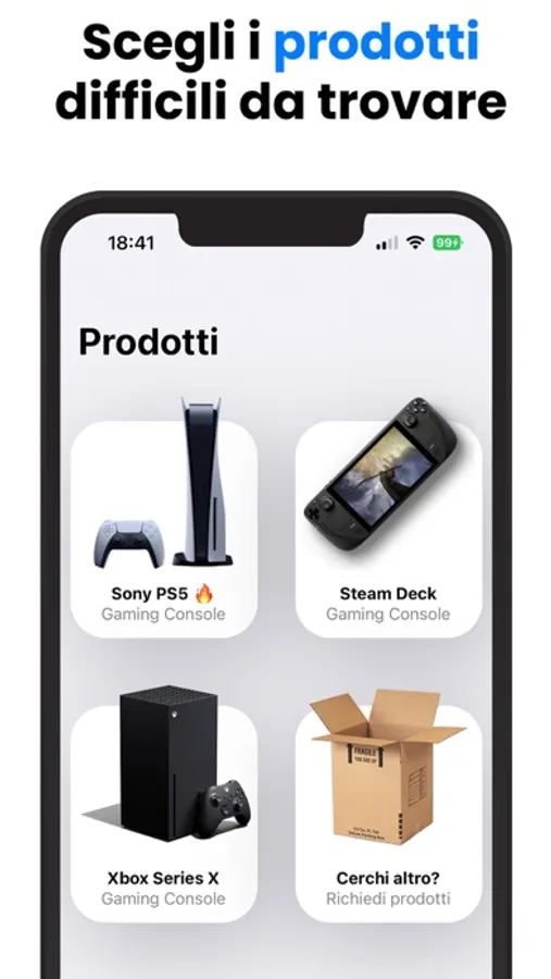 I prodotti vanno da PlayStation 5 (PS5), a Xbox Series X, a Steam Deck, e altri prodotti tecnologici o giochi difficili da trovare. Puoi richiedere anche l'aggiunta di prodotti non ancora disponibili nell'app.