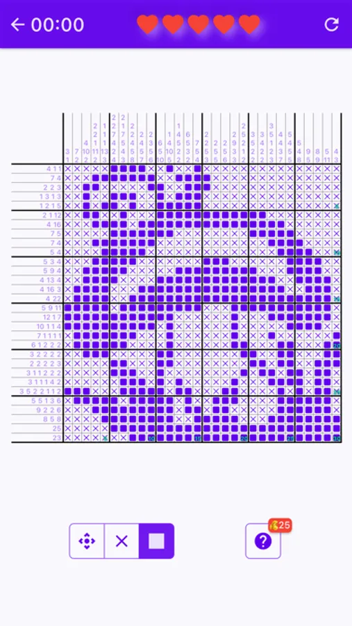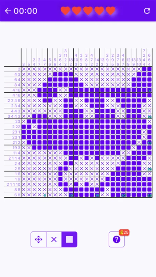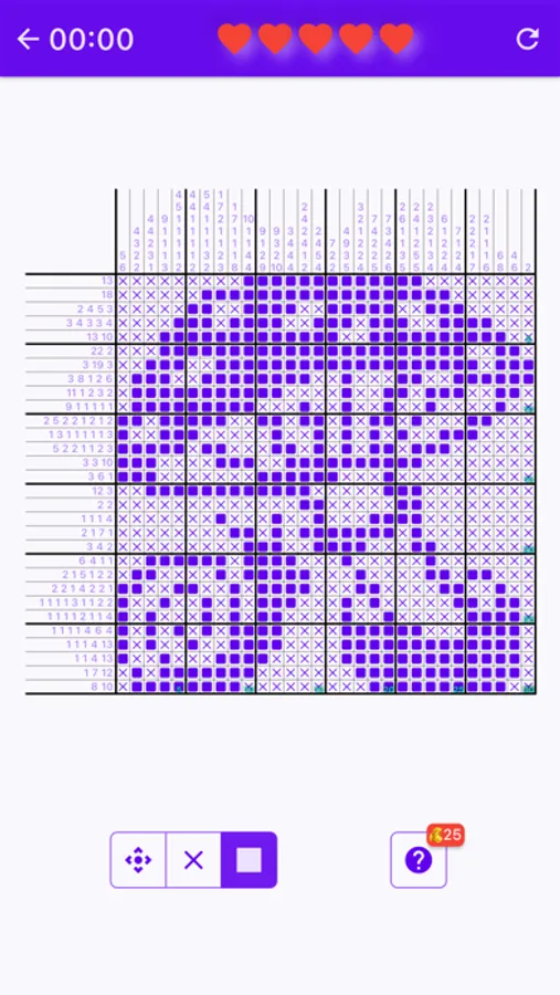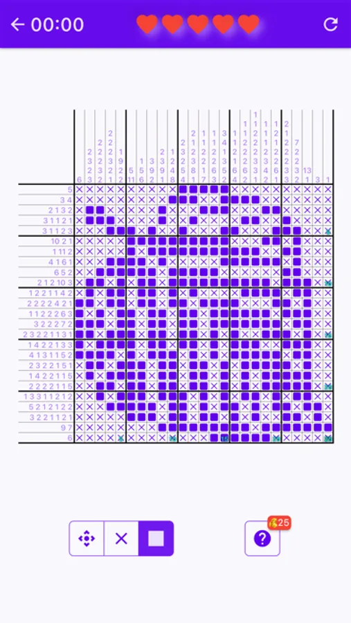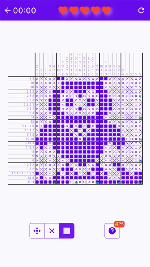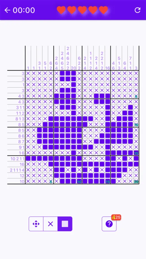 To solve a puzzle, one needs to determine which cells will be boxes and which will be empty. Solvers often use a dot or a cross to mark cells they are certain are spaces. Cells that can be determined by logic should be filled. If guessing is used, a single error can spread over the entire field and completely ruin the solution. An error sometimes comes to the surface only after a while, when it is very difficult to correct the puzzle. The hidden picture plays little or no part in the solving process, as it may mislead. The picture may help find and eliminate an error.