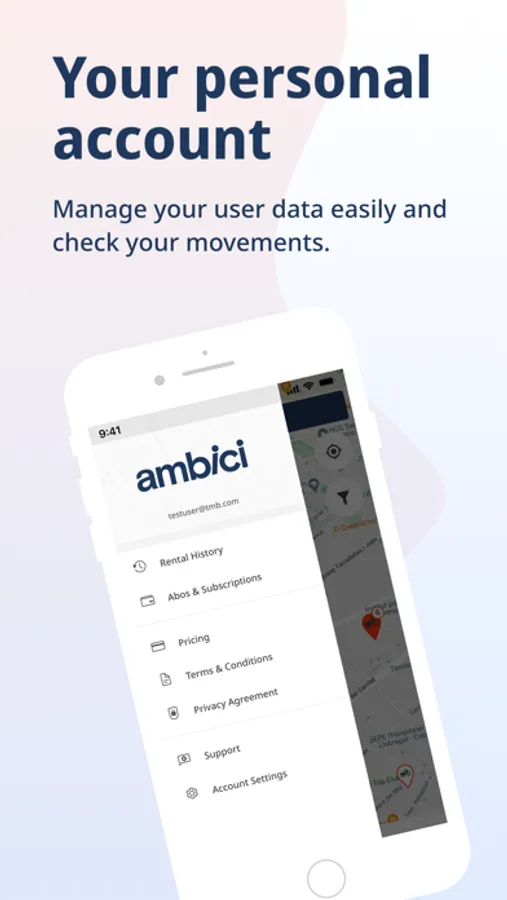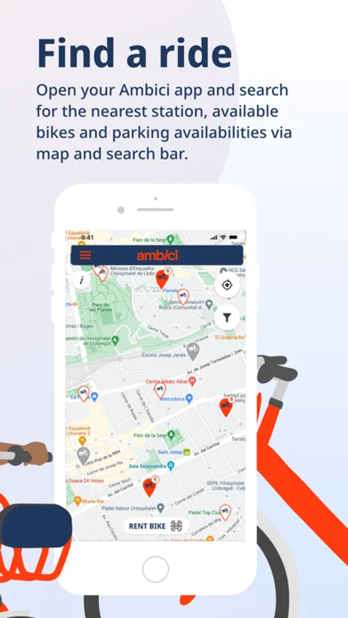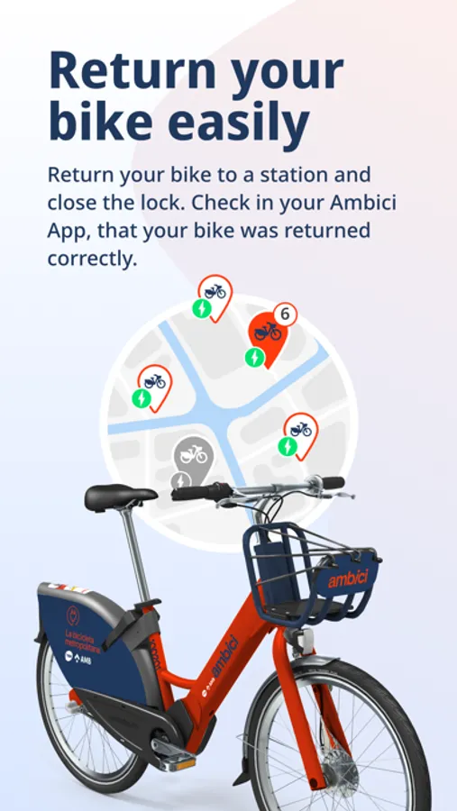 Open your Ambici app and search for the nearest station, available bikes and parking availabilities via map and search bar. Unlock your bike by scanning the QR code and enjoy your trip!