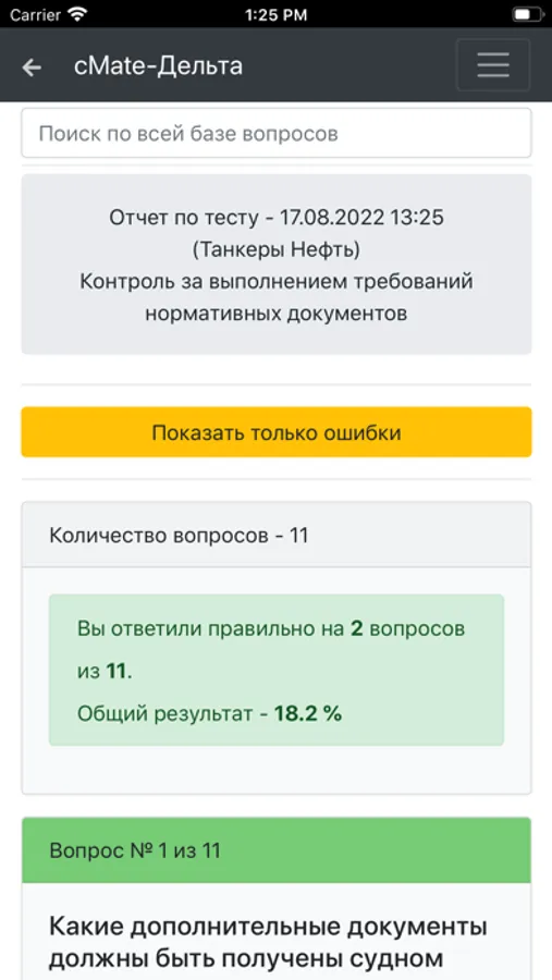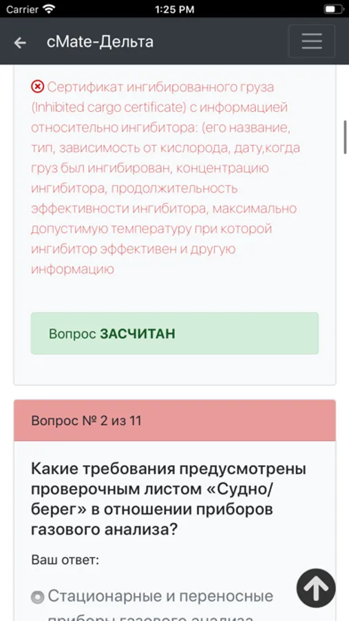 База приложения содержит 226 вопросов для проверки знаний командного и рядового состава в соответствии с международными и национальными требованиями.