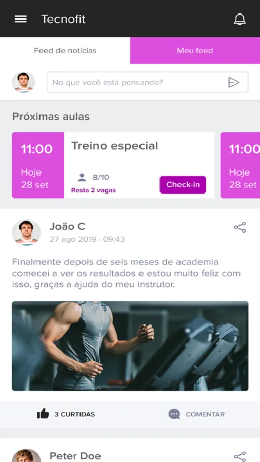 Através do app Academia Corpo e Alma o aluno pode interagir com sua rede pela timeline, acessar sua ficha de exercício com histórico de evolução de cargas, acompanhar suas avaliações físicas e fazer check-in nas aulas. Tudo isso na palma de sua mão para deixar seu treino mais dinâmico e interativo.