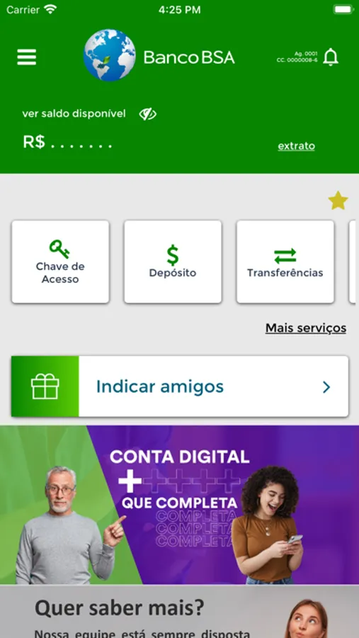 Conta Digital com pagamentos por depósito em conta, transferências, pagamento de Boletos, benefícios, serviços e outras funcionalidades que só uma Conta digital pode oferecer.