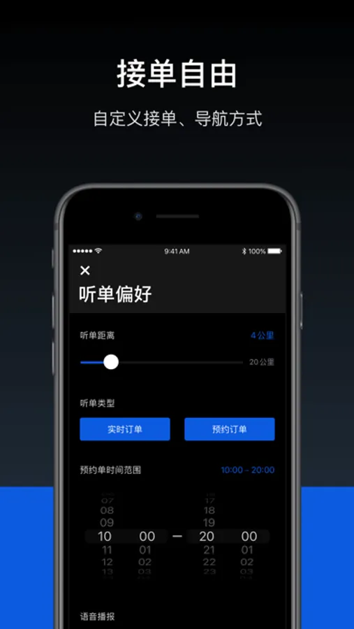 页面简洁,使用一键上手;多个渠道,多点收入;安全合规,全天派单,订单可选。
