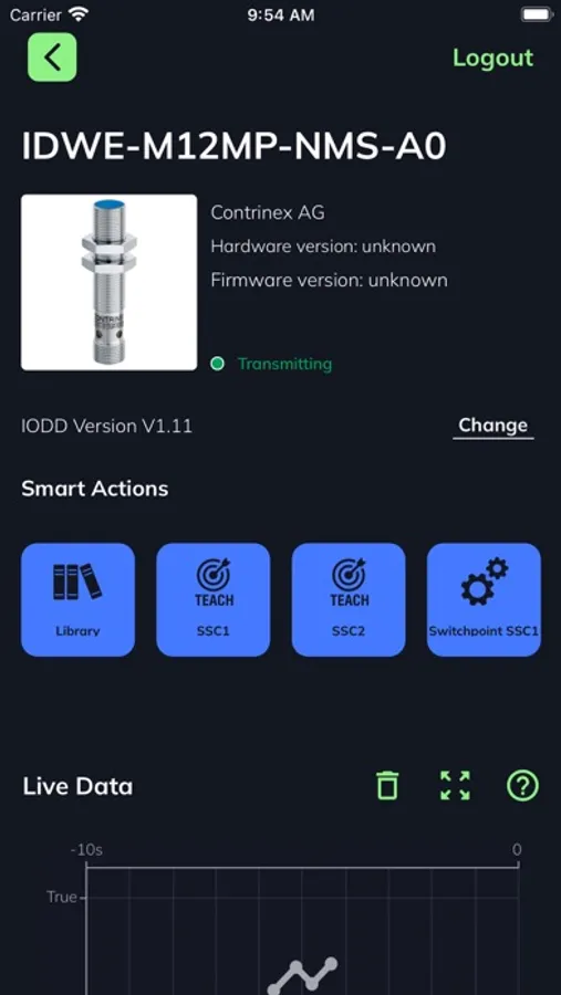 - access advanced action widgets, which manage features of compatible sensors in a user-friendly UX. You may for example access the Teach functionality of smart sensors, configure alarms, timers or counter super easily!