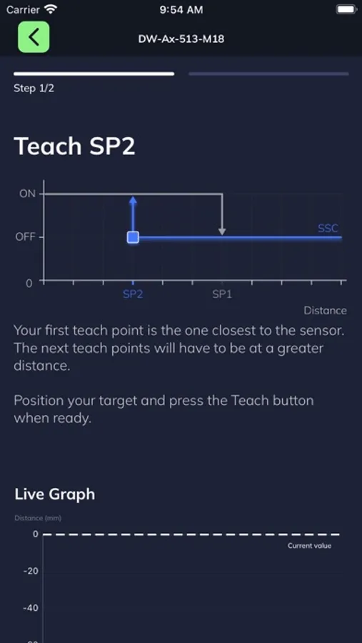 Once connected, you may see the live process data inputs* of the sensor, and check its configuration. If you prefer a visual representation, the graph module lets you check the behavior of the sensor in real time.