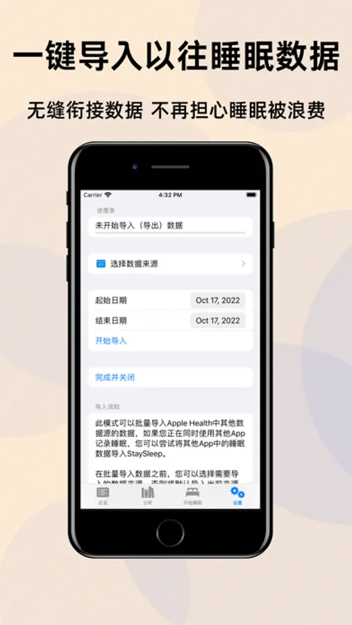 同时StaySleep也支持将睡眠数据保存到Apple Health健康应用中。另外,如果您曾经使用其他的睡眠分析类应用,您也可以将部分应用中的睡眠数据导入StaySleep中,更快地获取完整的熬夜热力图。