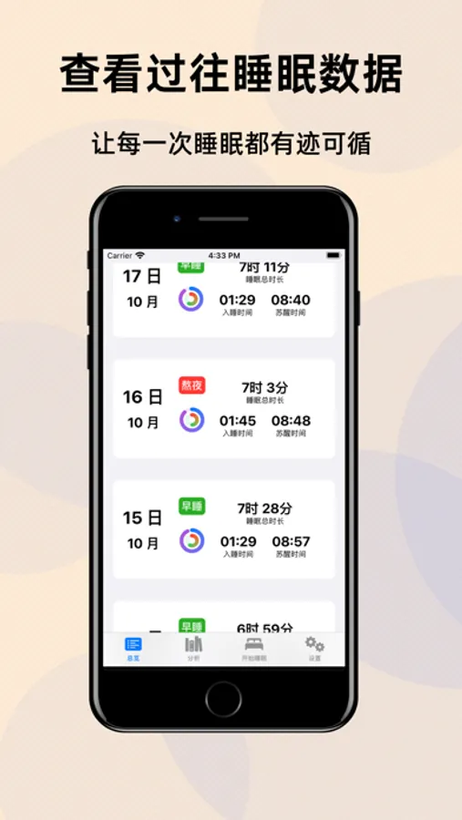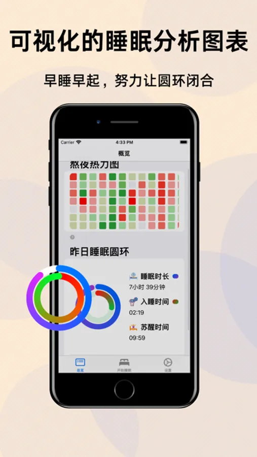 StaySleep还内置了环形图与过往数据查询的功能,您可以通过早睡早起,保证睡眠时间,来获得闭合的环形图。当环形图的所有圆环都闭合时,恭喜您,昨晚睡了一个好觉。