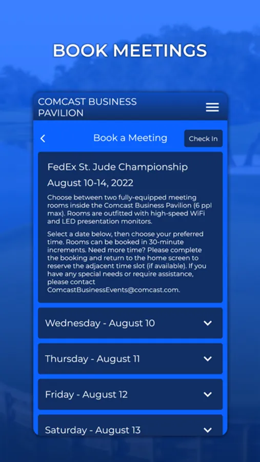 Use the app to book time in one of our two fully-equipped meeting rooms inside the Comcast Business Pavilion. Meeting rooms are outfitted with high-speed WiFi and LED presentation monitors.