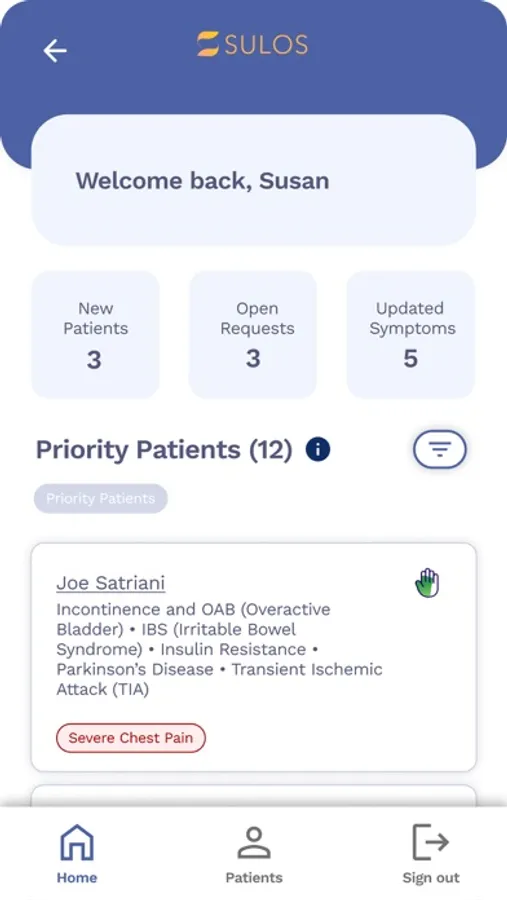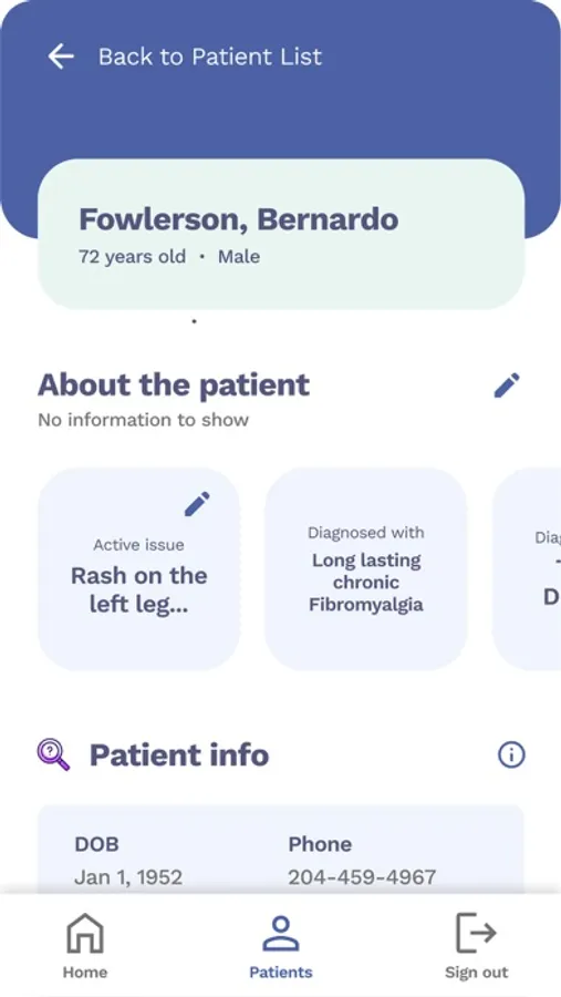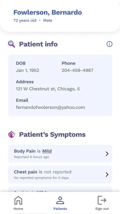 This app enables users to monitor and track their patients between visits. User is able to log a request or answer symptom questionnaire on behalf of the patient. Any patient that falls above or below set thresholds for symptoms or biometric data will be prioritized with a flag. Also, able to communicate with patient and caregiver through the app's Request feature.