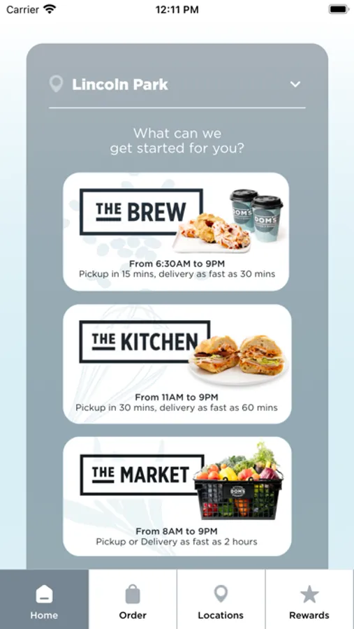 Order groceries, breakfast, lunch, dinner, and all the snacks in between for pickup at Dom’s or delivery by Dom’s.