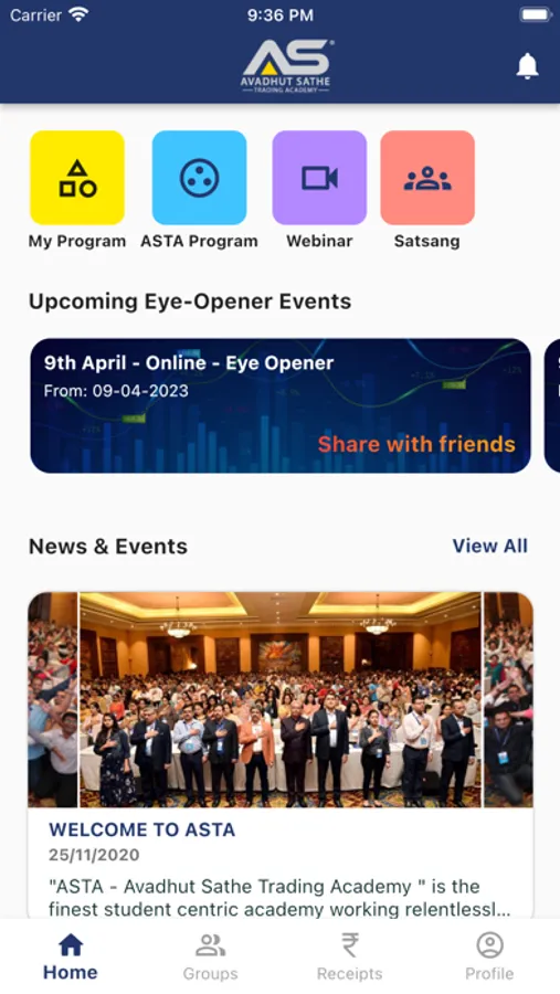 The app is designed to help ASTA students register to upcoming programs and events , attend online webinars, enrol for upcoming satsangs and more.